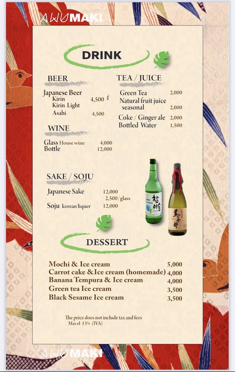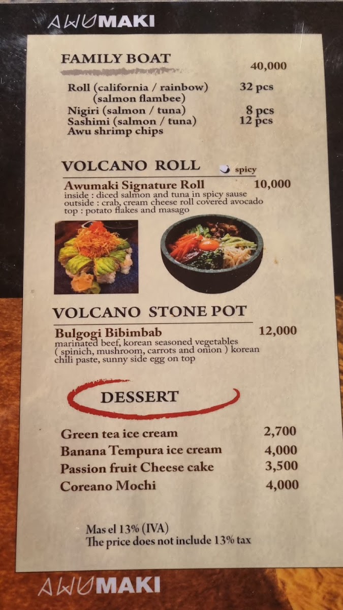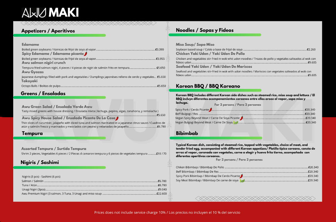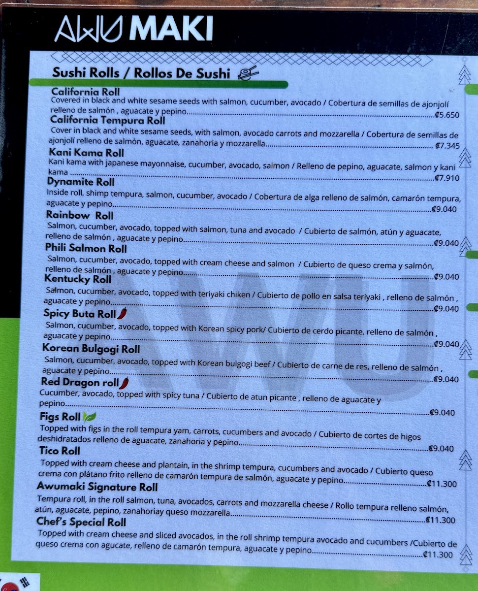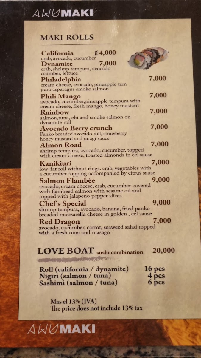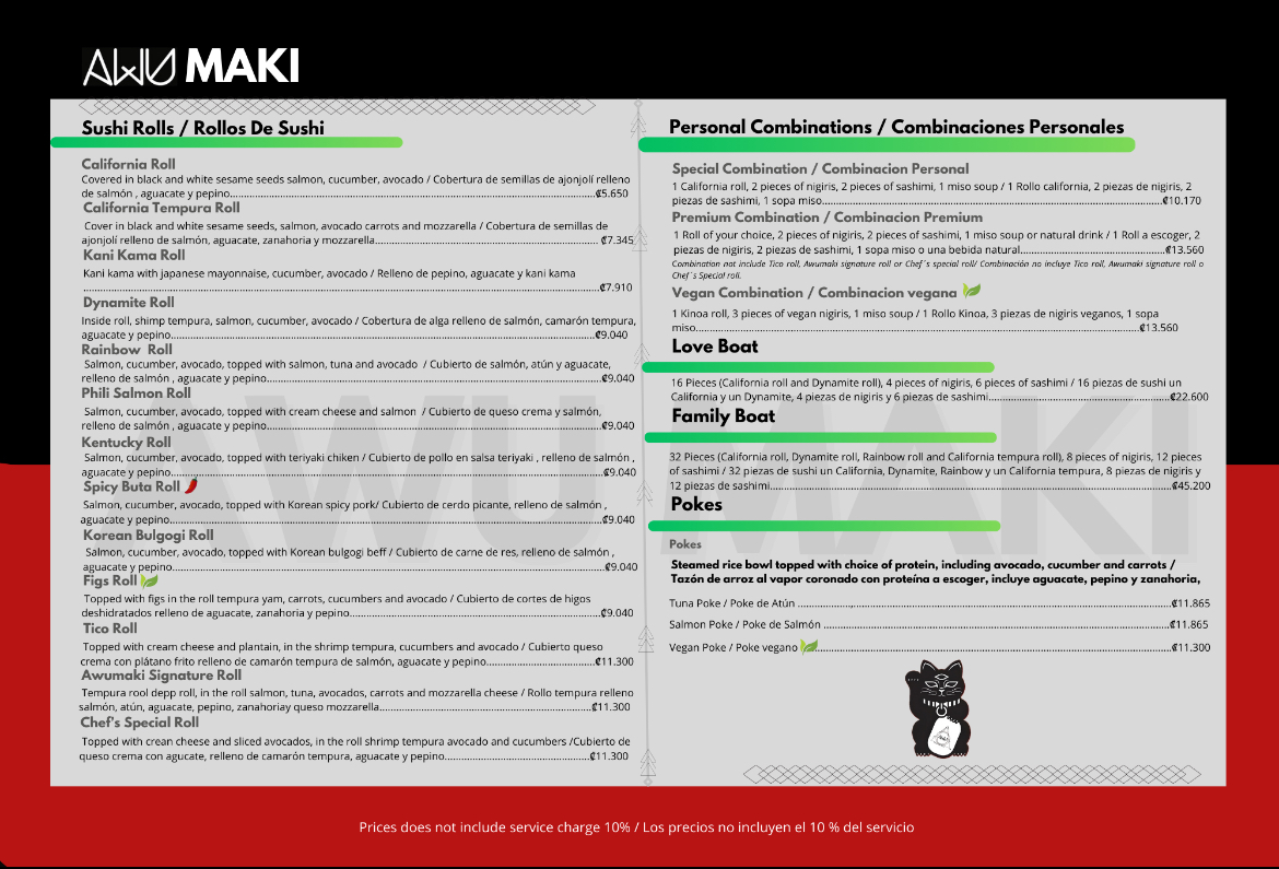If you're in the mood for sushi, the Awumaki Sushi Menu is your go-to spot. Just 10 km west of the Iglesia Católica in La Palma, San Carlos, La Fortuna, Costa Rica, this hidden gem serves up a mix of fresh, flavorful sushi and Asian-inspired dishes that will leave you craving more. Whether you're a sushi enthusiast or new to the scene, their menu offers something for everyone. From classic rolls to innovative creations, every bite is a delicious experience. You’ll find that every dish is prepared with care, using the finest ingredients to ensure a unique and memorable meal. With a casual vibe and warm atmosphere, it's the perfect place to unwind and indulge in some of the best sushi around.